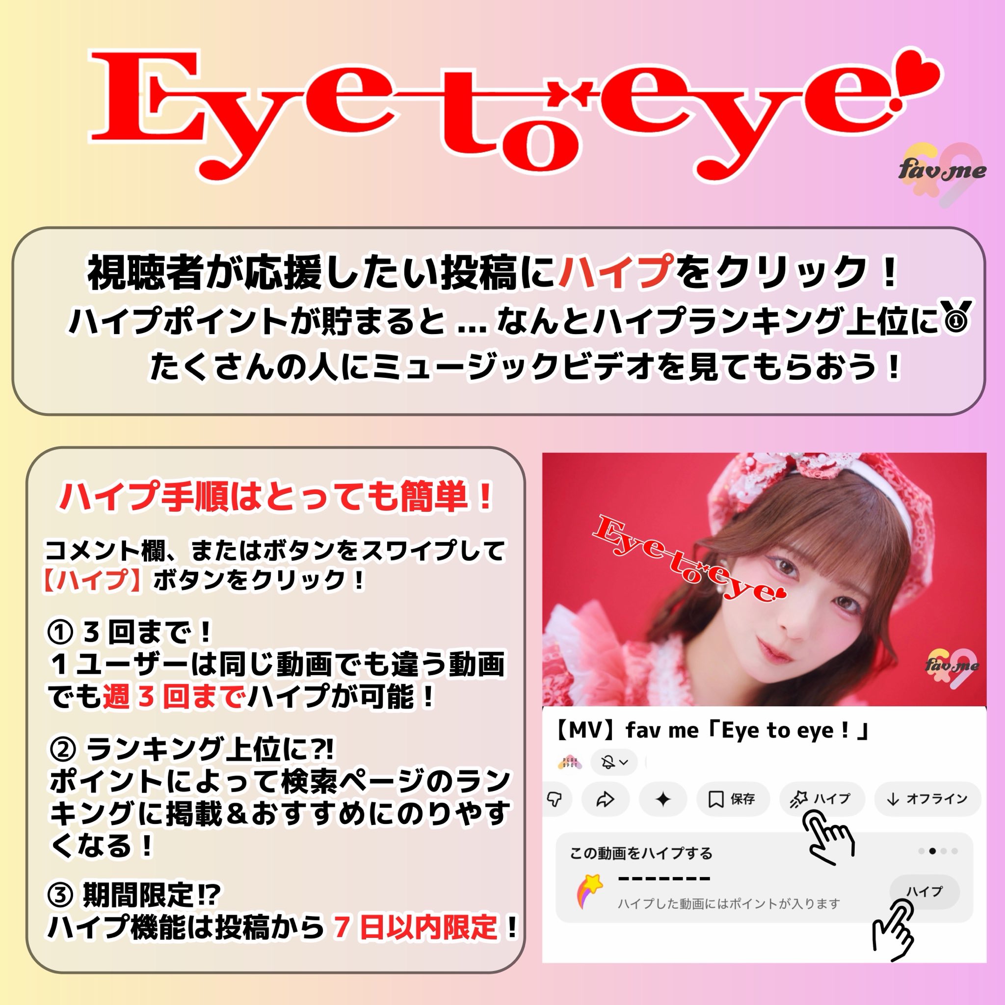 \\🙏🏻 ご協力のお願い🙏🏻//多くの人へ届くように、【fav me Music Video】『Eye to eye!』YouTubeの''ハイプ''機能で応援をお願いいたしますꉂꉂ📢#ふぁんみー の皆さまの力でランキング上位へ🔥ご協力をよろしくお願いいたします🙇♀️🙇♂️【MV】🔗https://youtu.be/wu00QLbrN_Q#favme #ふぁぼみー