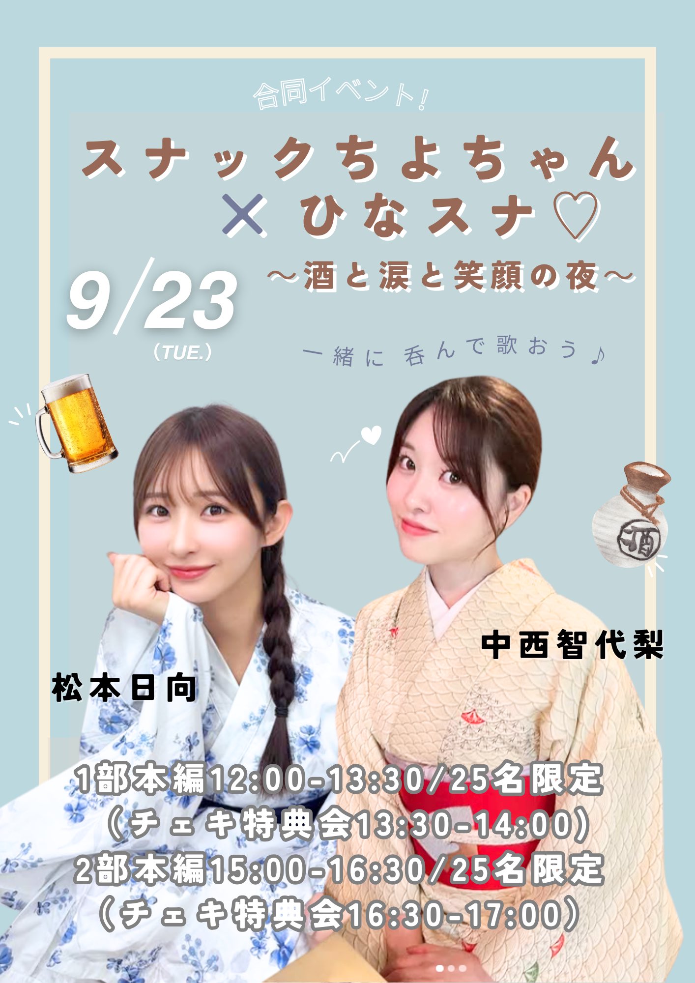 スナックちよちゃんを日向と一緒にします🍶🫶確実に盛り上がるし違う楽しさあると思うので是非遊びに来てください✨そして今回初のオリシャン🍾を作ることになりました!!是非記念にゲットしてください♪デュエットチケット限りあるのでお早めに🥺🎤