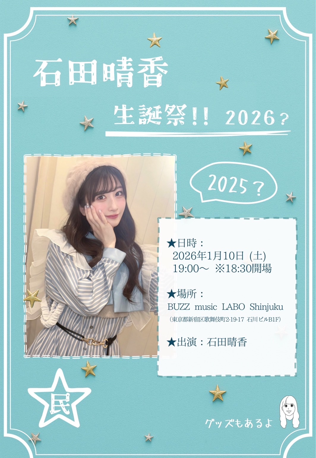 【㊗️生誕祭開催決定🎊】石田晴香生誕祭やります!!!📍 BUZZ music LABO @新宿📅2026年1月10日⏰19時〜年を跨いでの生誕祭開催は初めてですが、とっても楽しみです✨たくさんの方にお会い出来ますように!!チケ発は本日18時より開始です👀🎫https://www.s2.e-get.jp/horifan/pt/