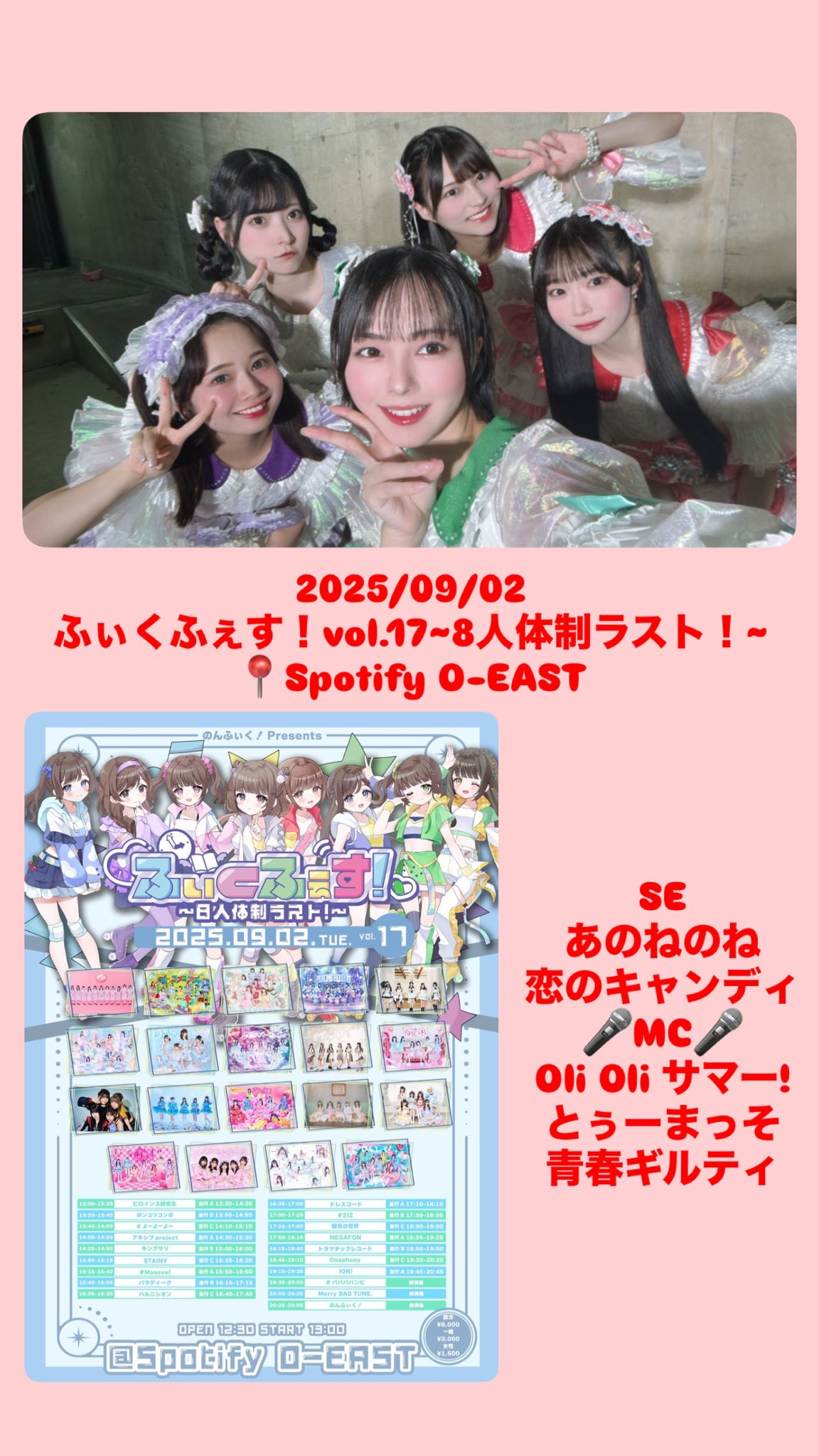 2025/08/02 #バンビのセトリふぃくふぇす!vol.17~8人体制ラスト!~📍Spotify O-EASTSEあのねのね恋のキャンディ🎤MC🎤Oli Oli サマー!とぅーまっそ青春ギルティ本日もありがとうございました♡#ババババンビ 次のライブ予定は9/13Devil ANTHEM. 10th Anniversary Year