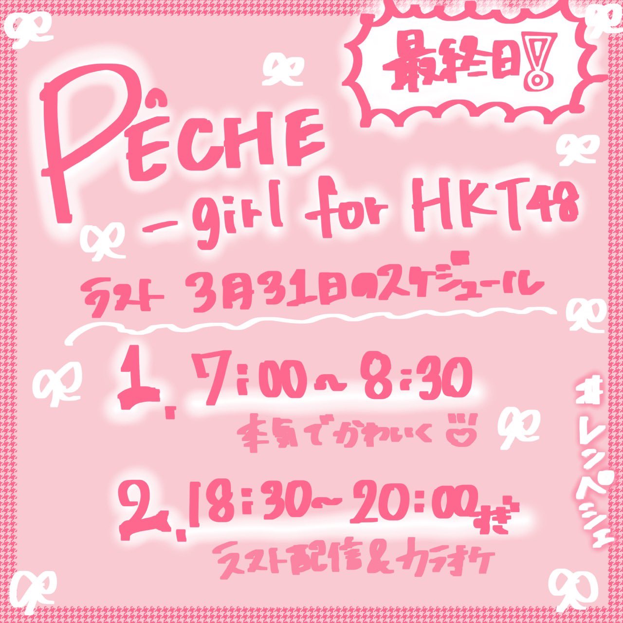 『PECHE_girl for HKT48 決定オーディション』参加させていただきます!🍑期間は3月25日12:00〜3月31日19:59までの1週間となっています。ぜひ応援してくださったら嬉しいです!!https://www.showroom-live.com/r/48_KAREN_FUKUI?t=1774356958