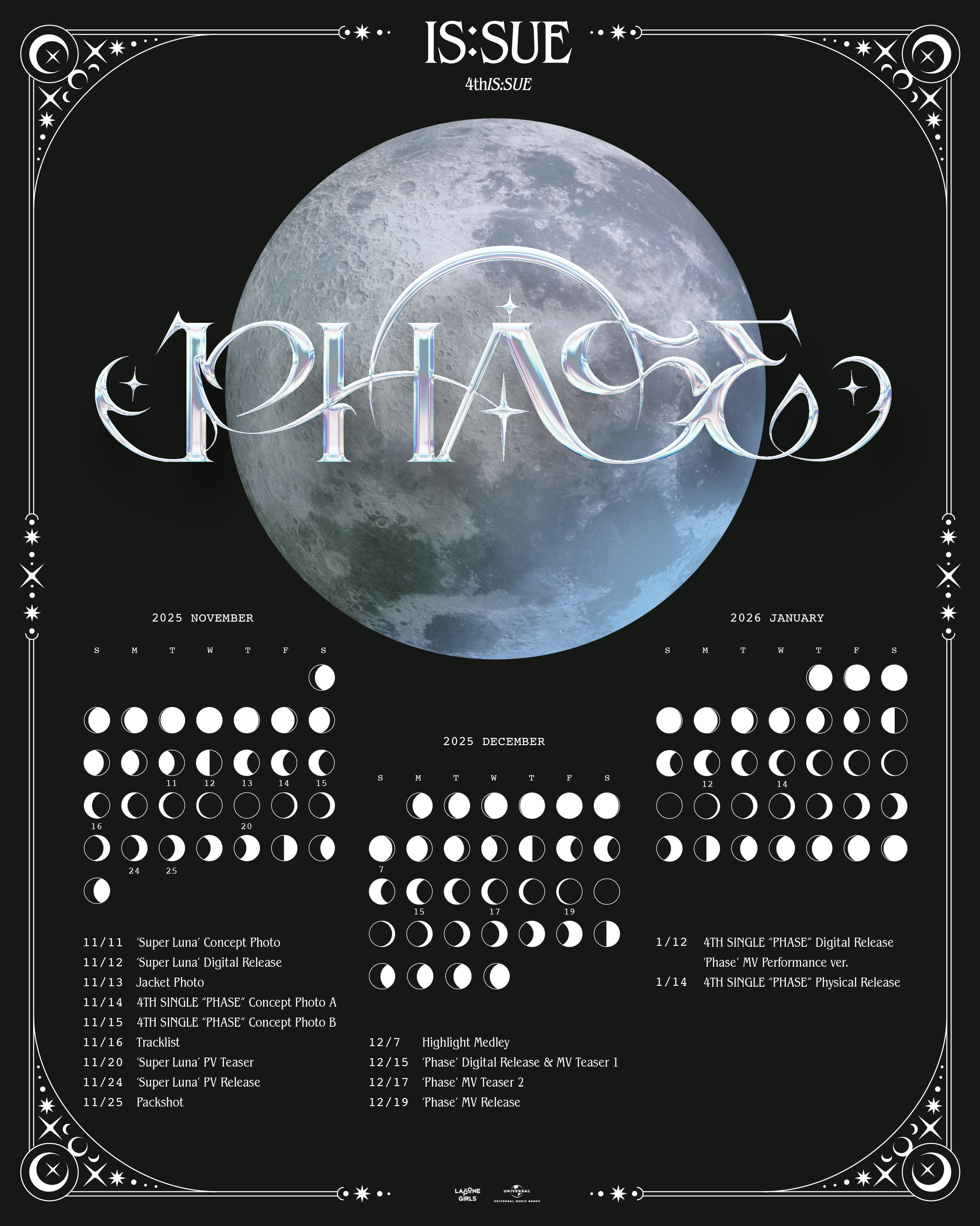 IS:SUE 4TH SINGLE "PHASE" LOGOIS:SUE's moon is comingin 2 nights: November 1st.That's when you'll see us🌔https://IS-SUE.lnk.to/PHASE#ISSUE #イッシュ #이슈#PHASE