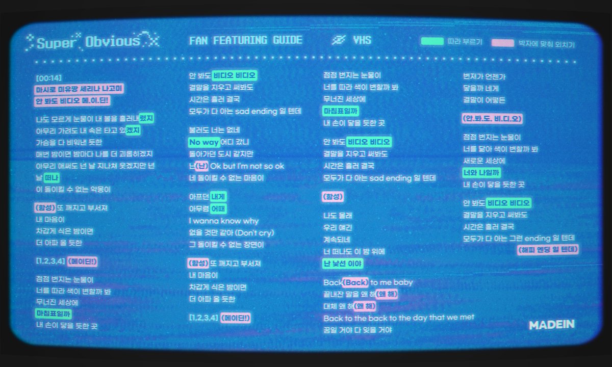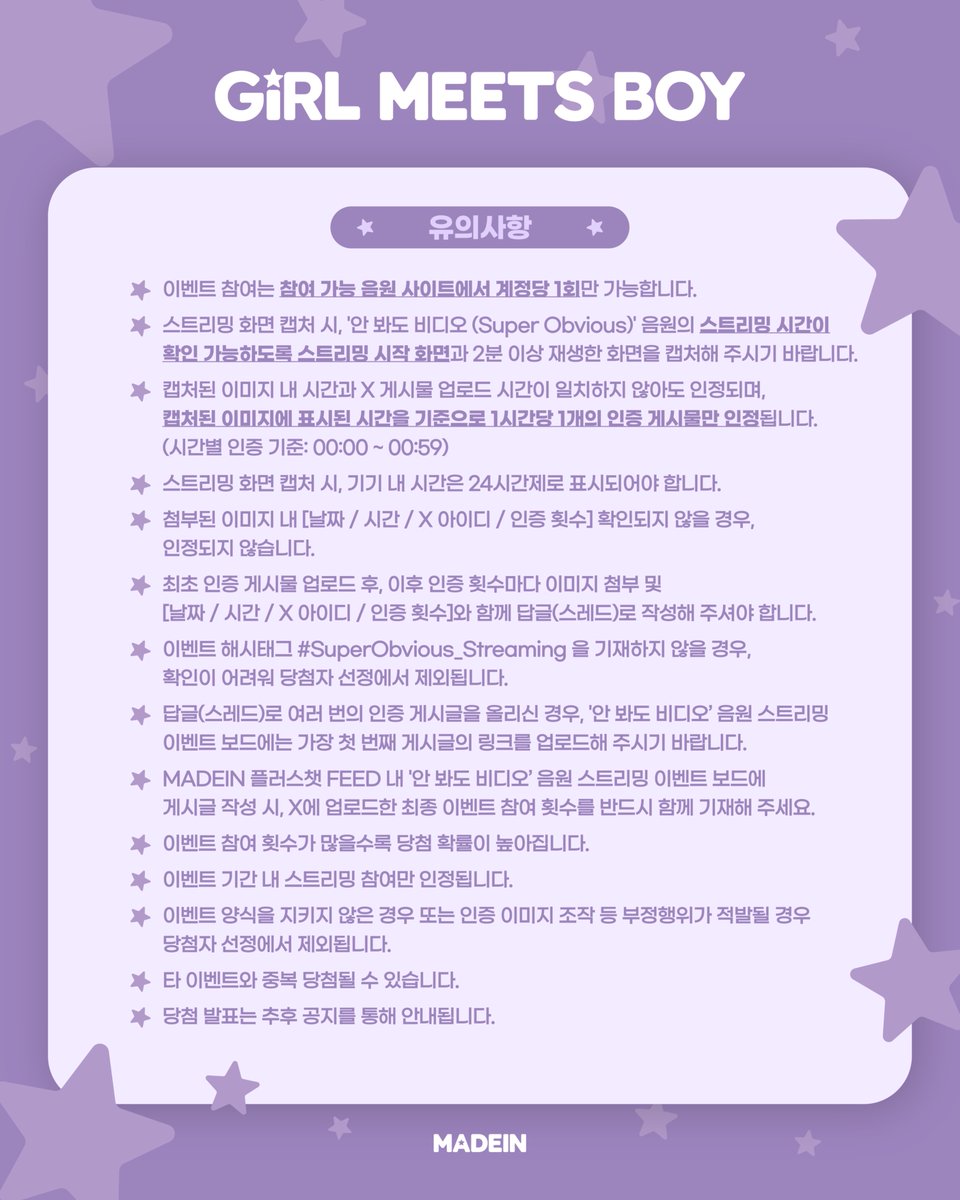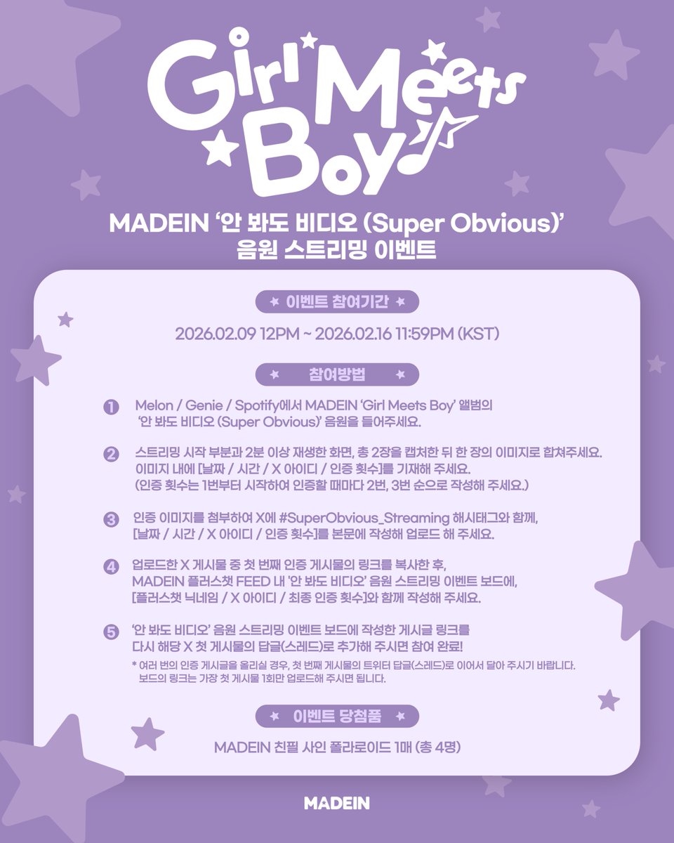 1. Melon / Genie / Spotify에서 MADEIN ‘Girl Meets Boy’ 앨범의 ‘안 봐도 비디오 (Super Obvious)’ 음원을 들어주세요.