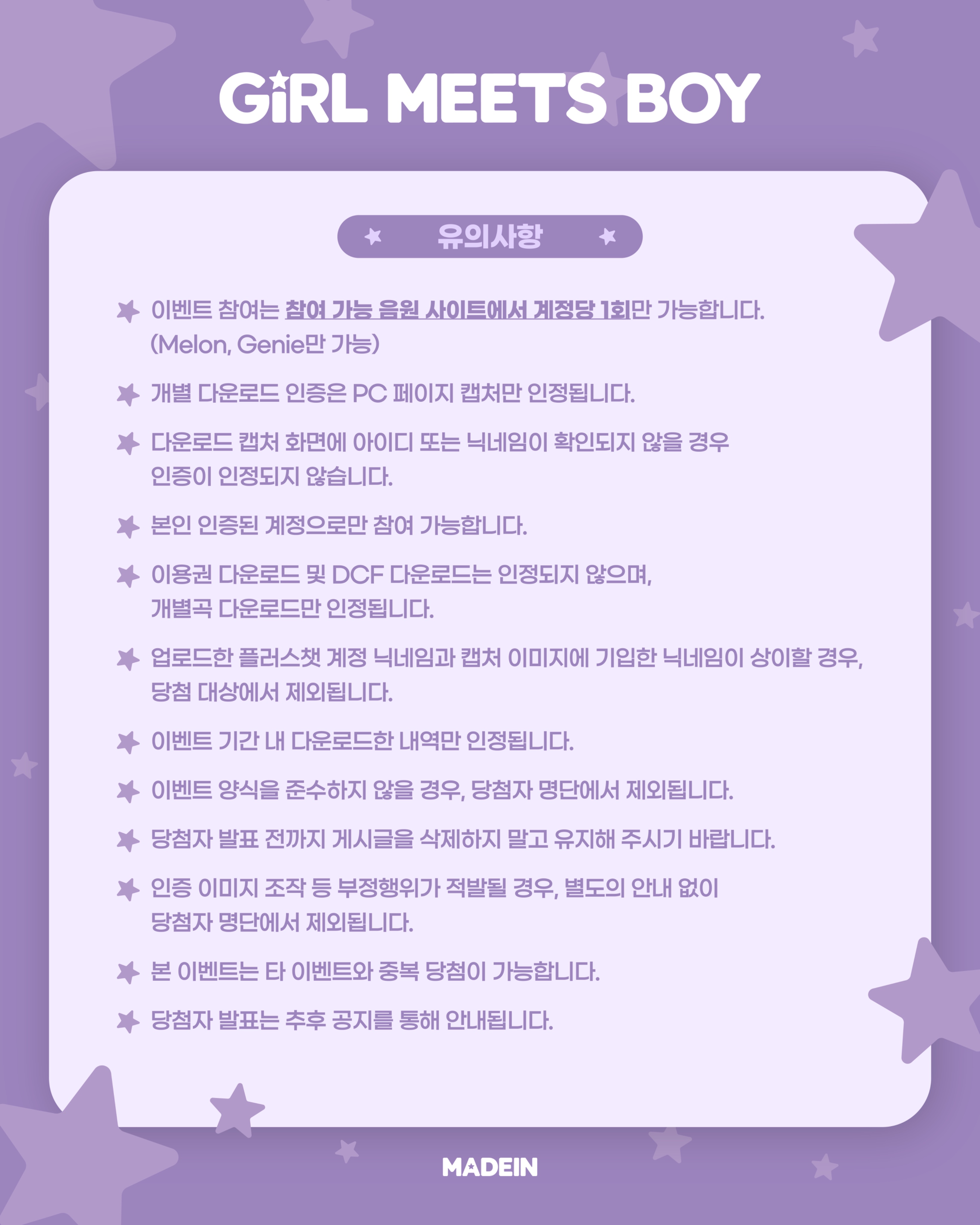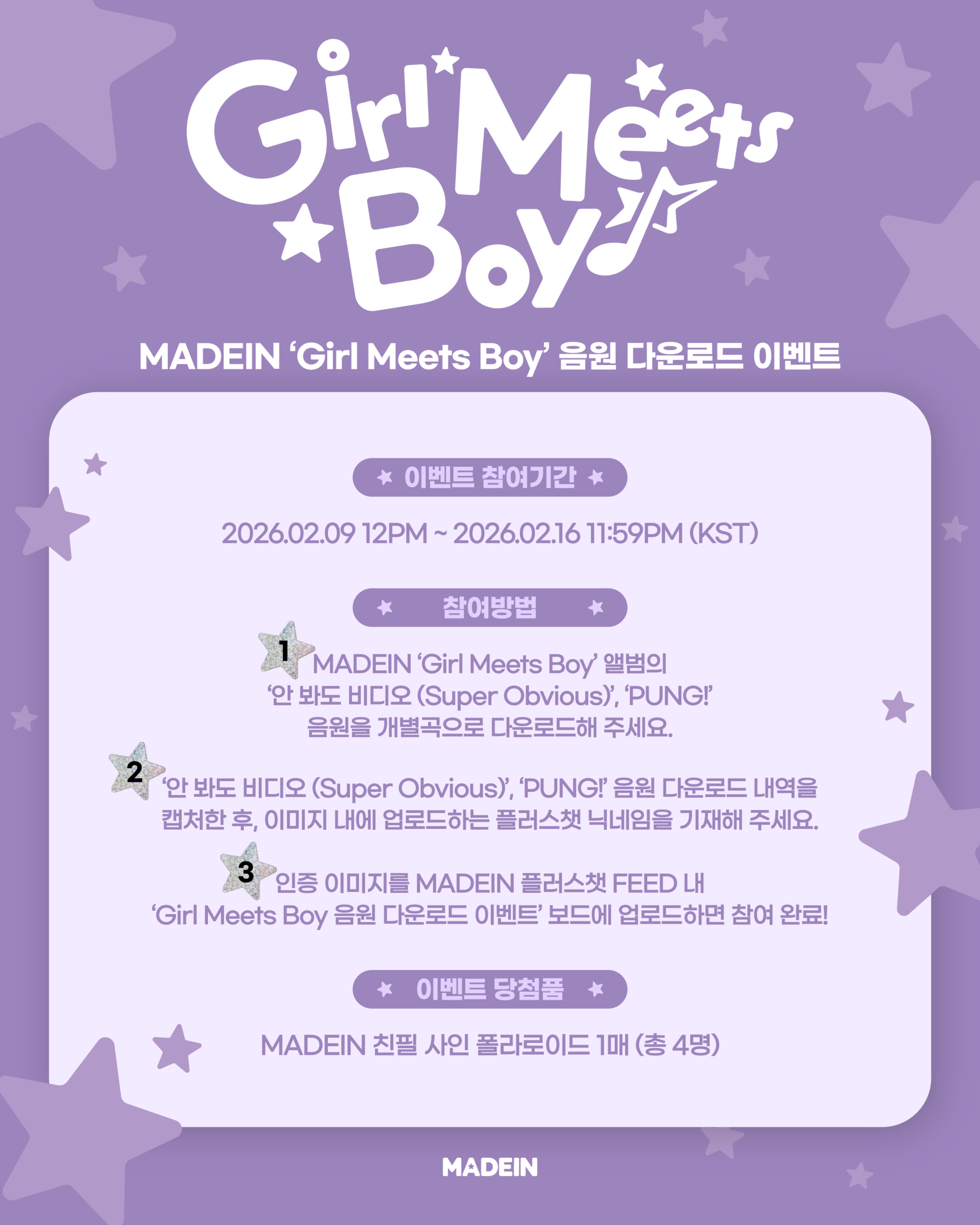 * MADEIN 플러스챗 FEED 내 '안 봐도 비디오’ 음원 스트리밍 이벤트 보드에 게시글 작성 시, X에 업로드한 최종 이벤트 참여 횟수를 반드시 함께 기재해 주세요.