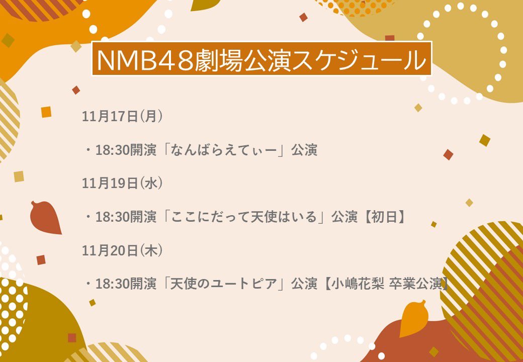 🐆 #NMB48 information 🐆【🎙本日の公演スケジュール】18:30- #天使のユートピア公演【 🪽出演メンバー】青原優花、安部若菜、泉綾乃、川上千尋、小嶋花梨、坂下真心、坂田心咲、桜田彩叶、塩月希依音、新澤菜央、芳賀礼、平山真衣、三鴨くるみ【⚡️DMM LIVE! ON DEMAND】http://dmm.com/lod/nmb48/