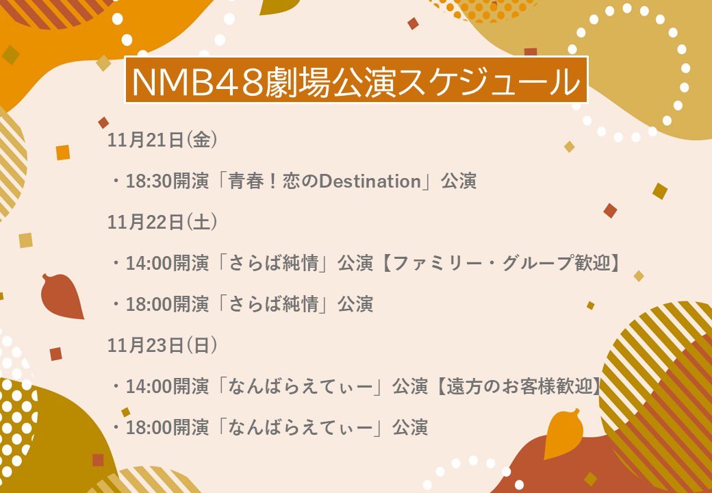 🐆 #NMB48 information 🐆【🎙本日の公演スケジュール】18:30- #さらば純情公演【 🕺出演メンバー】青原和花、板垣心和、坂本理紗、田中美空、中川朋香、西由真、西島梨央、西田帆花、福野杏実、宮本杏海、吉見純音、内田愛彩、宮崎紗衣、宮原心音、村井悠莉、山口美桜【⚡️DMM LIVE! ON DEMAND】http://dmm.com/lod/nmb48