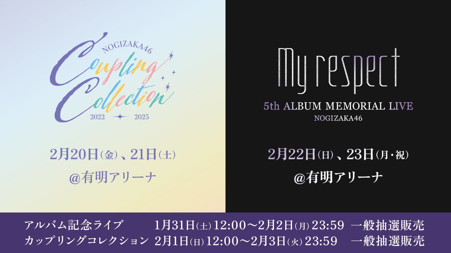 有明アリーナにて開催するライブ公演の会場チケット一般抽選販売を受付中です🎫1⃣Coupling Collection 2022-20252月20日(金)・21日(土)https://r10.to/nogizaka46_coupling_collection⌛明日2月3日(火)23:59まで2⃣5th ALBUM MEMORIAL LIVE『My respect』2月22日(日)・23⽇(月・祝)https://r10.to/nogizaka46_memorial_live⌛本日2月2日(月)23:59まで#乃木坂46