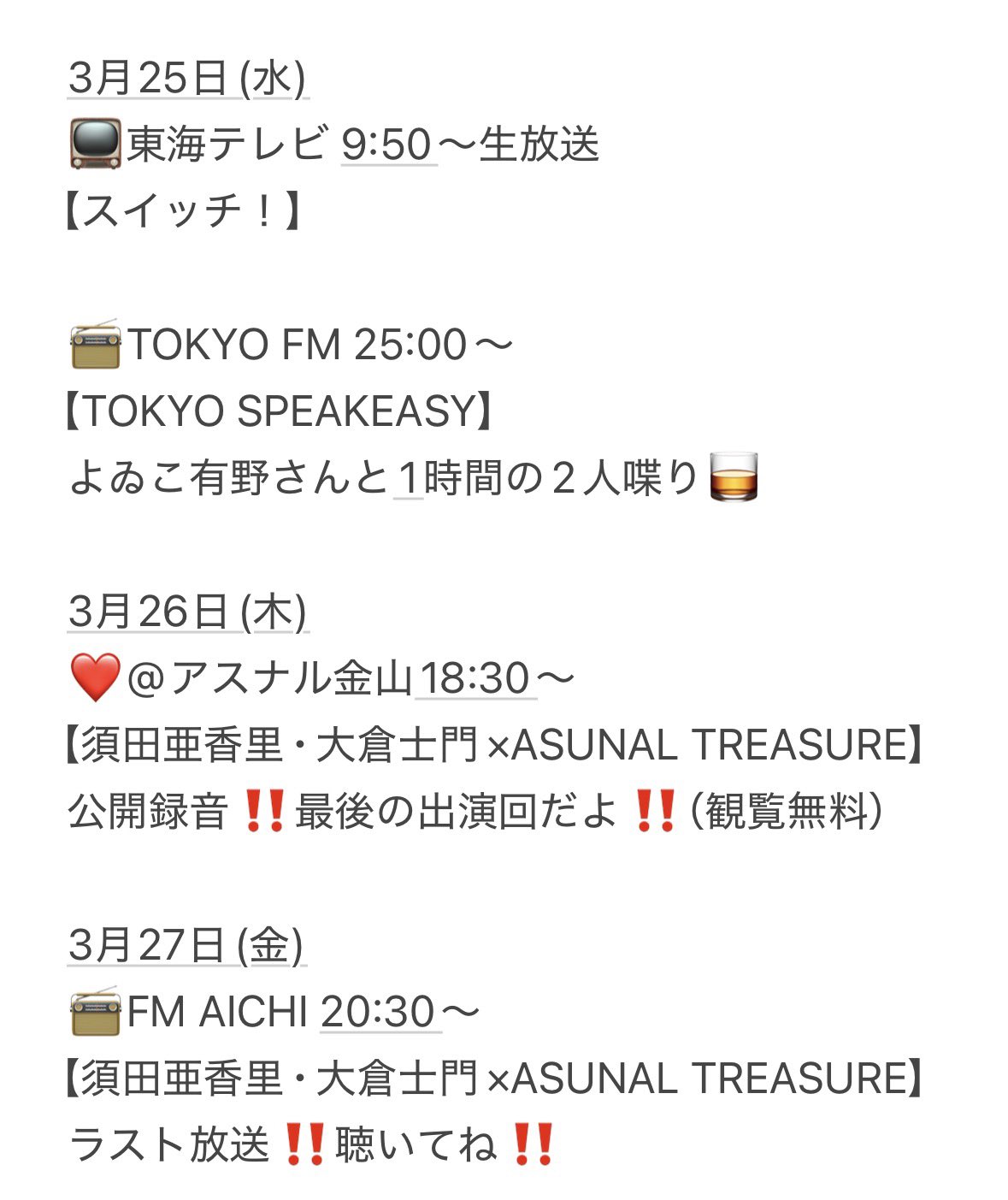 3月25日(水)TOKYO FM 25:00〜【TOKYO SPEAKEASY】有野さんとラジオ📻10代の頃から知ってくださっていて、ガッツリ共演してるのは10年前から。私の人生の黒歴史も転機も全て見守り、時にはボソッと助言をくれるお父さんみたいなお方👨🏻✌🏻 #speakeasyradiko→https://radiko.jp/share/?t=20260325250000&sid=FMT